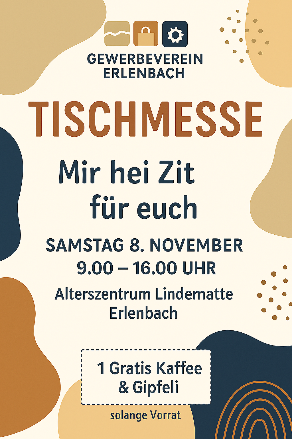 Am letzten Samstag im November lud der Gewerbeverein Erlenbach zur ersten Tischmesse im Alterszentrum "jetzt Lindenmatte" ein. Dreizehn Gewerbetreibende aus der Gemeinde Erlenbach und Latterbach präsentierten ihre Produkte und Dienstleistungen. Jeder Aussteller hatte ein bis zwei Tische als Ausstellungsfläche zur Verfügung, wodurch die Messe kompakt blieb und dennoch eine große Vielfalt bot.